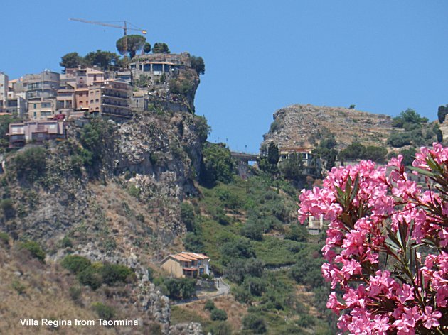 Looking up to Castelmola from Taormina with the telephoto lens you can see how Villa Regina is perched on the edge of a precipice and it really is a wonder that Sue sits out on our balcony so close to the edge? Normally she won't go near any drop of more than a few feet let alone a few hundred!