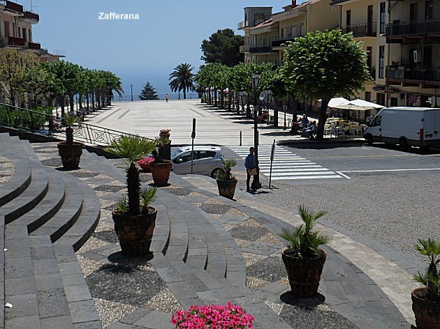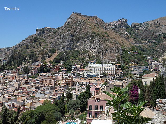 Castelmolo is a little village sitting on a 530m mountain top high above Taormina which is about 300m vertically below us and 3km by road. It is a favourite excursion for those staying in Taormina who come up for the views and the abundance of little restaurants which mostly have fine views out to sea and up to Mount Etna smoking away 3000m above. We had booked the Villa Regina which is perched on the edge of a crag so that we look down almost vertically to Taormina from our balcony and it is that view which is pictured at the top of this page! Our room is at the corner of the building so we have a view spanning 180 degrees and is air conditioned which is a blessing. Because of our altitude it is a lot cooler than down in Taormina, there are nice sea breezes so walking around is quite pleasant and a bus service runs every hour and takes about twenty minutes into the town so the car can stay parked.