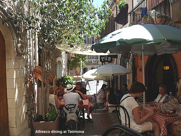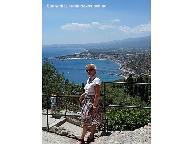 Villa Sonia has a deal with a Lido down on the beach where we pay them €7.50 each and we get picked up, transported to the beach at Mazzeo and are provided with all the necessary equipment like sun beds, brollys and beach towels etc. so off we went. The lido had its own restaurant which did not look great and was a bit pricey so we strolled along the beach a few yards to a really nice one called Lido Tropicana. One of the waiters was married to an English lady and they have a B&B called The Beach House while directly across from the Lido was the Hotel Calipso so either might be good places to stay if you fancied a beach holiday close to Taormina. They will arrange airport transfers if you don't want to drive and there are regular buses up to the town. We had a little too much wine and sun that day so after going down round all those bends in the bus to town that evening we were not up to eating anything but contented ourselves with the best ice cream we have had yet. I had Pistachio with Cassata and it was truly scrumptious and I was truly gratified to borrow an American expression that Les taught me!