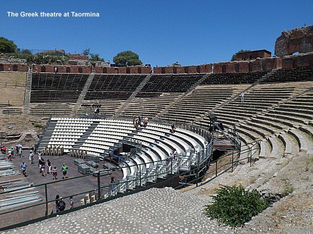 The road down to Taormina is quite exciting with some tight turns and hair raising precipices so you just have faith in the bus driver (or pilot) and tighten your seat belt! The main attraction of Taormina is its situation overlooking the sea and across to Etna. The Greeks built their theatre here in 3C BC with that view in mind, then 'yer Romains rebuilt it in 1C AD and were not really interested in the view as they wanted it for gladatorial blood baths so built a brick wall to obscure the view. Some centuries later, possibly for the flourishing tourist trade, someone knocked a hole in the middle of the wall to restore the view and make it into a bit of a romantic ruin.