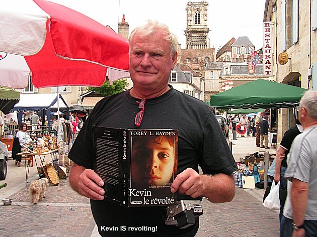 The canal gets prettier as you approach Clamecy (locals pronounce it Clamcy) and we found an excellent mooring at Villiers-sur-Yonne which is pictured at the top of this page. We decided to stay here until the Hockeys arrived on 12th July just in time for Bastille Day so Kevin decided to move on before getting his marching orders. He bought a nice expensive chicken at Clamecy Saturday market and cooked us a feast that night. Only problem was he began cooking very late so it was after 9pm before we ate and I could have eaten a horse. Here you can see Kevin trying to read a book called "Kevin the revolting" but as he doesn't speak French he did not pick up many tips. Here I digress for a sample of Kevins humour.
