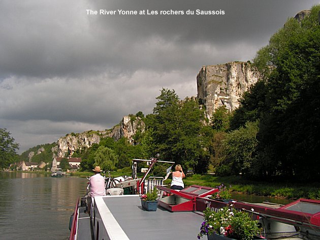 We were cycling back and retrieving both ours and the Hockeys cars each day and we used them to explore the hinterland as we travelled. Downstream from Châtel-censoir you arrive at a particularly lovely section of the river Yonne at Les rochers du Saussois. We stopped for lunch at Mailly le Chateau and I cycled back with Carol for the cars. On the way my back wheel developed a severe attack of the wobbles and I discovered several spokes broken. We soldiered on regardless and recovered the cars but we then had to position a car at the next destination and use it to recover the other.